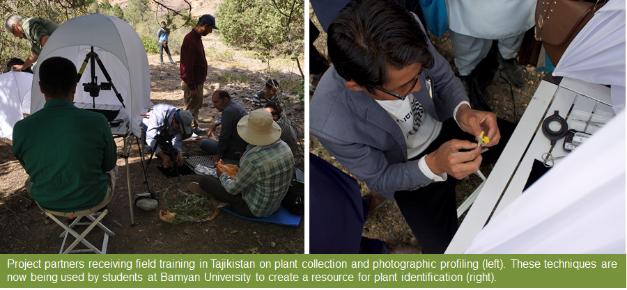 In order to increase skills and knowledge about the plants of Bamyan and how to monitor the effects of a reduction in collection intensity, students at Bamyan University have been trained to undertake a range of tasks including vegetation surveys, specimen collection, detailed anatomical photography as a plant identification resource, and interviewing local communities about the plants they collect and what they use them for. Long term monitoring points have been established, and as the project progresses we will discuss how to include routing monitoring in the university curriculum in order to ensure sustainability of skills acquisition.